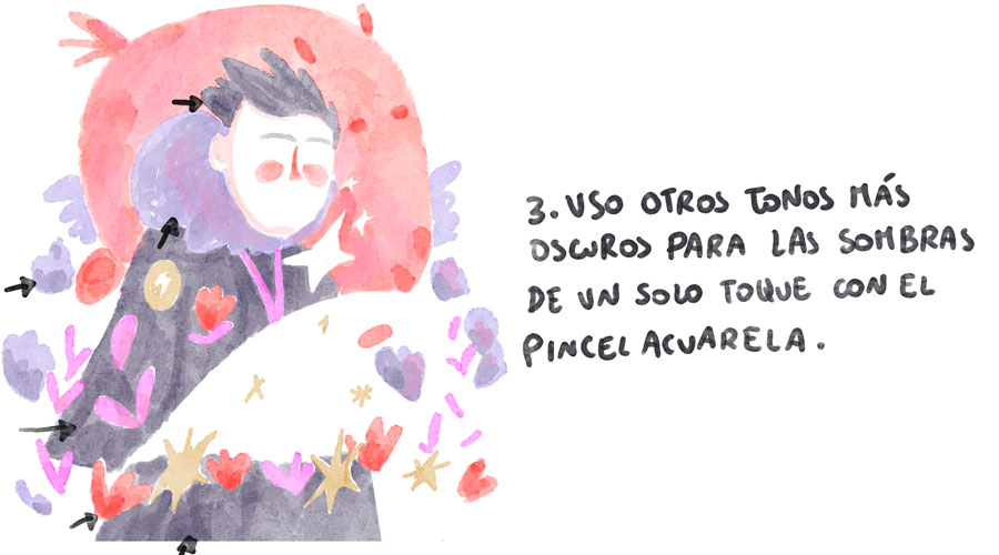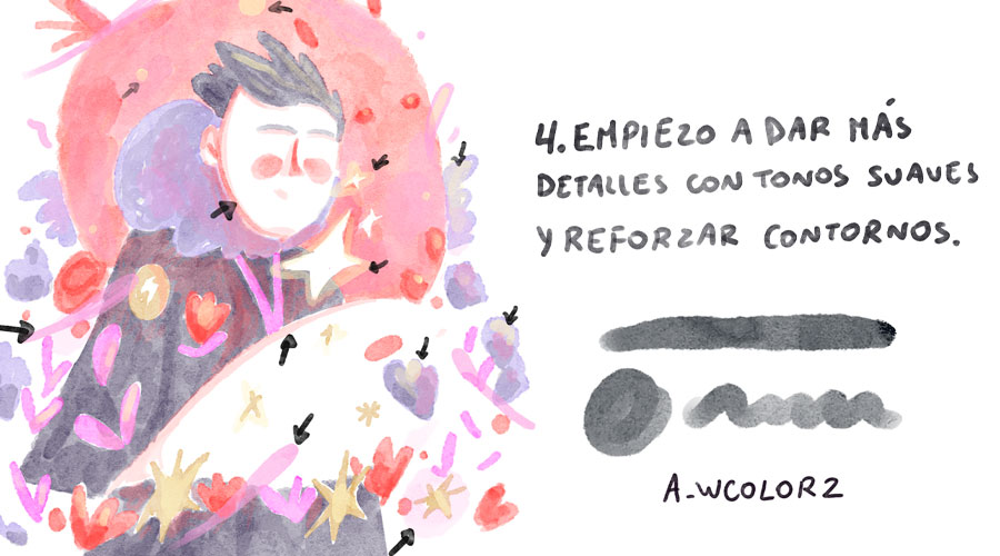 Ahora refuerzo con tonos suaves y el pincel a_wcolor2 que tiene un acabado suave y bonito para dar luces y mezclar. También refuerzo contornos con tonos oscuros.