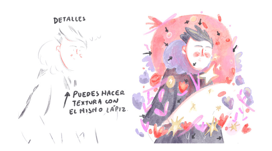 Finalmente utilizo pinceles grafito carboncillo para dar texturas y reforzar más la ilustración final y tenga un acabado tradicional.