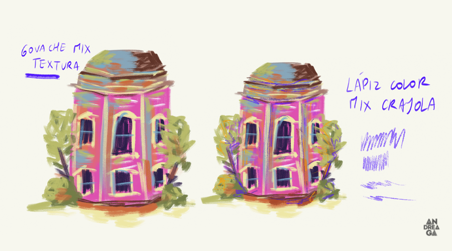 5. Estudio de casas y colores: De las cosas interesantes por dibujar siempre son las casas, lugares, pero si agregas nuevas combinaciones de color, puedes salir más de tu zona de confort. Usé los pinceles del pack Gouache para Procreate, puedes conseguirlo aquí con la clase desde 0.