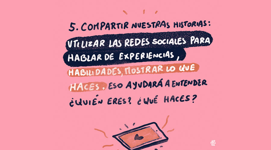 5.Cuando quieres empezar con las redes sociales a mostrar tus ilustraciones o lo que haces, siempre es importante entender el ¿Qué haces? ¿Quién eres? Ya que esas dos preguntas son potentes para mostrar nuestra habilidades, contar historias de nuestro trabajo y que las personas entiendan y sepan lo que hacemos, de esa manera también construyes una gran comunidad. Aquí tienes el tema de ¿Cómo promocionar mi arte en redes sociales?