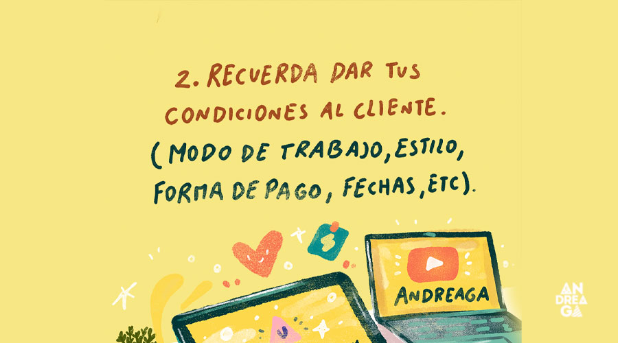 Cuando vamos a trabajar con un cliente en ilustración es importante siempre darle la cotización y condiciones de nuestro trabajo, es decir, ¿Cómo trabajo en ilustración? ¿Cuál es mi proceso de ilustración? Esto es importante ya que el cliente sabrá cómo son los tiempos, procesos y sobre todo tu estilo. Además siempre se debe dar las formas de pago, fechas y más. Aquí te dejo un videín sobre los contratos y cláusulas que debes tener en ilustración para que no te engañen.
