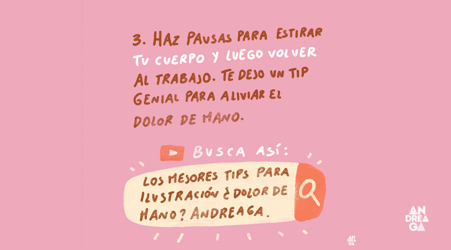 Los ilustradores estamos muchas horas trabajando sentados, en la computadora o ilustrando en la tableta gráfica y si no estiramos, no hacemos ciertos ejercicios, con el tiempo podemos tener un fuerte estrés, podemos inflamarnos, tener ciertas dolencias de cuello, espalda o mano. Haz siempre pausas pequeñas para que puedas hacer estiramientos, de esa manera cuidarás bastante tu salud.