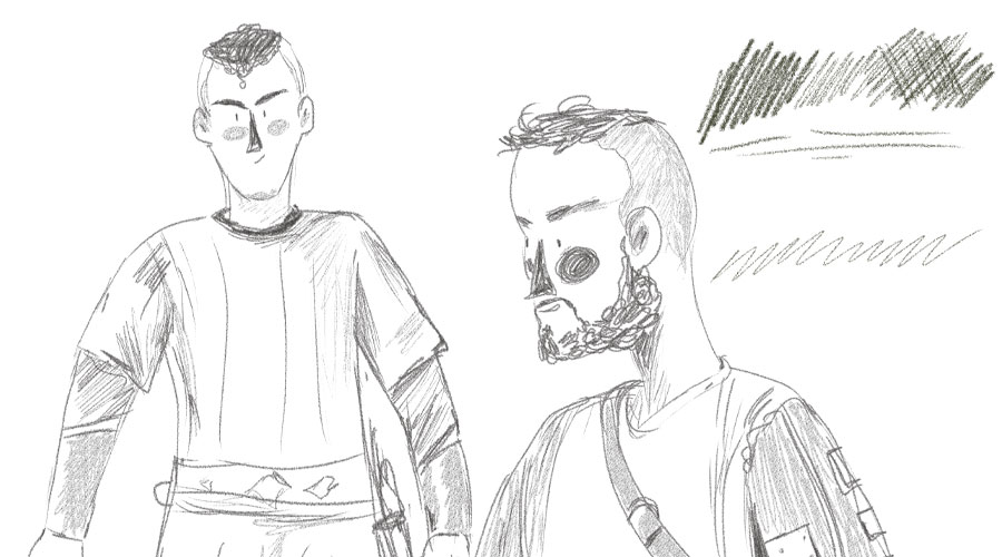 Texturas: Un buen recurso en tu propio sketch es utilizar las texturas como un estudio, para que puedas añadir otras técnicas como scumbling o garabatos, aquí lo utilizo en el cabello o puedes empezar con ritmos, verticales, diagonales u horizontales, eso dará detalles y ciertas sombras a tus personajes.